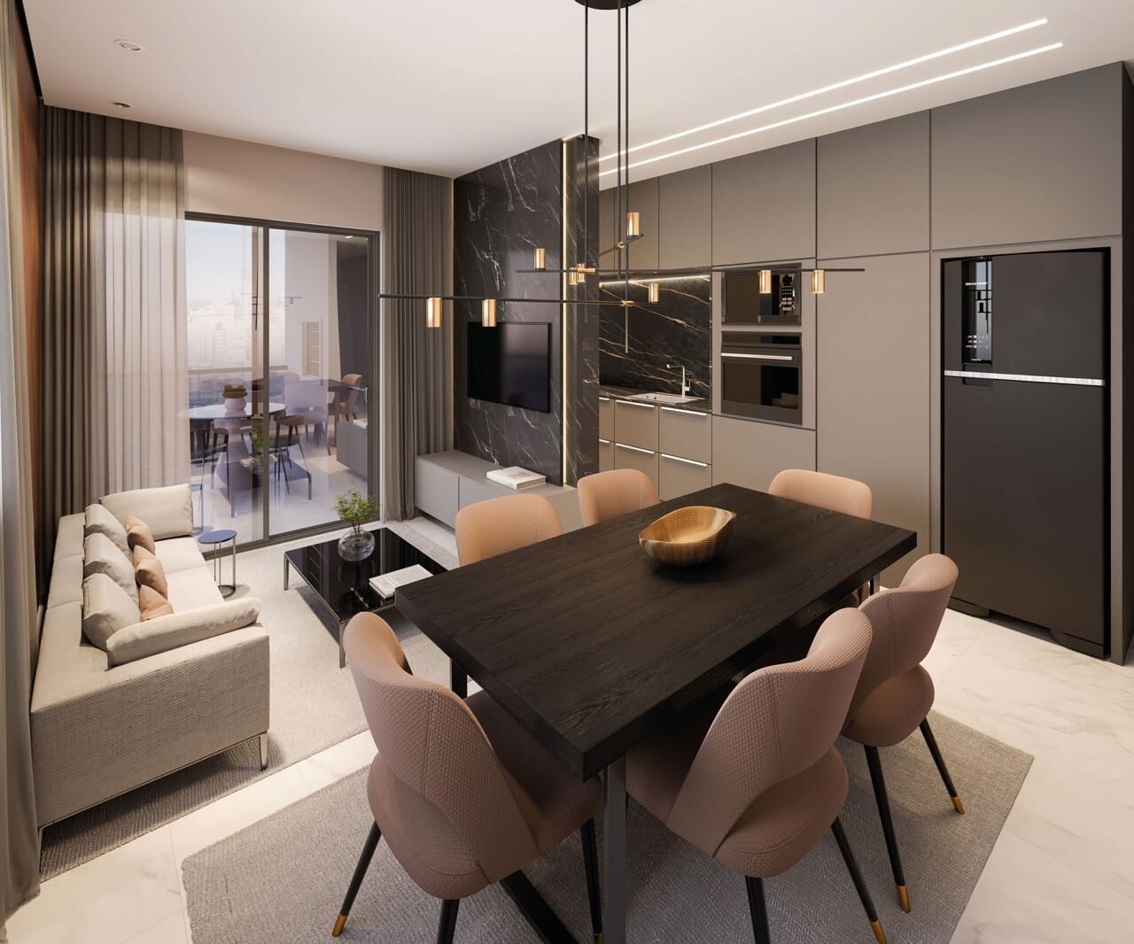 Este moderno apartamento foi planejado para oferecer conforto, funcionalidade e um acabamento impecável. Possui 1 suíte + 1 dormitório, com ambientes amplos, bem distribuídos e totalmente rebaixados em gesso. As áreas íntimas contam com piso laminado, enquanto o living e os demais ambientes recebem porcelanato de alta qualidade. As portas laqueadas, fechaduras e dobradiças em aço inox reforçam o padrão superior dos materiais utilizados.