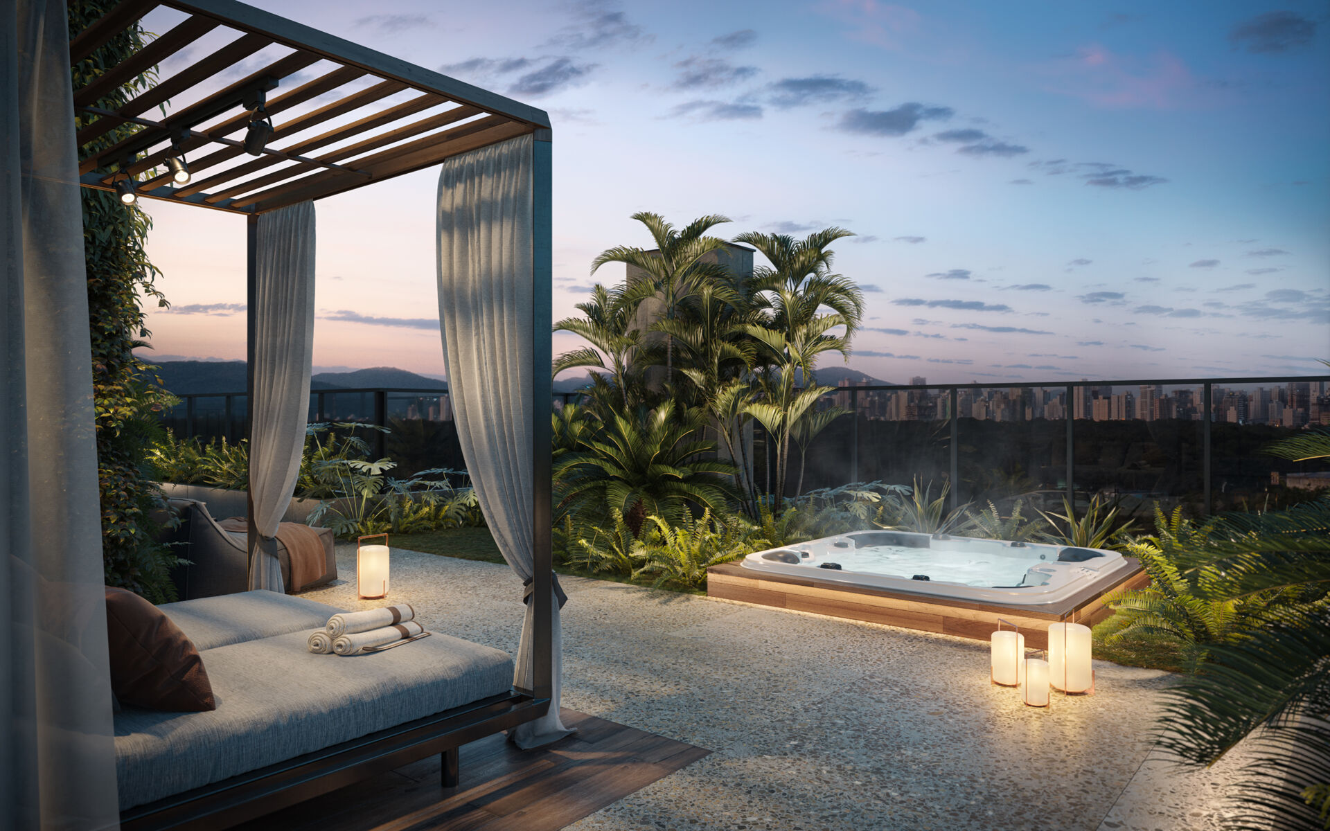 A área de lazer é ampla e distribuída em ambientes integrados, com destaque para o rooftop panorâmico, que oferece vista privilegiada e espaços destinados ao relaxamento e socialização. Entre os ambientes estão piscina externa no rooftop, prainhas com ofurôs, bangalôs, espreguiçadeiras, solarium, estar da piscina, bar da piscina com máquina de gelo, além de panoramic lounge e cine lounge outdoor.