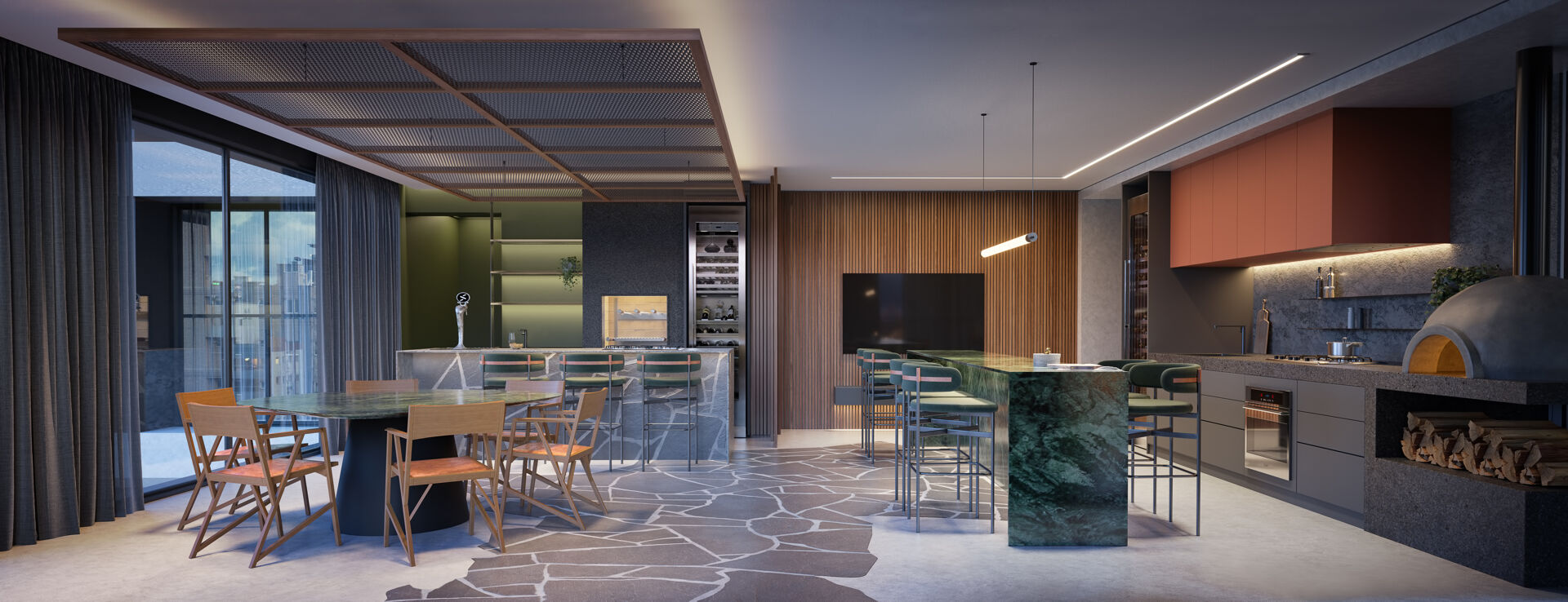 No rooftop, o lazer atinge um novo patamar, com salão principal rooftop, bar 180º, espaço gourmet rooftop e sky decks, proporcionando vistas panorâmicas e ambientes exclusivos para convivência e eventos.